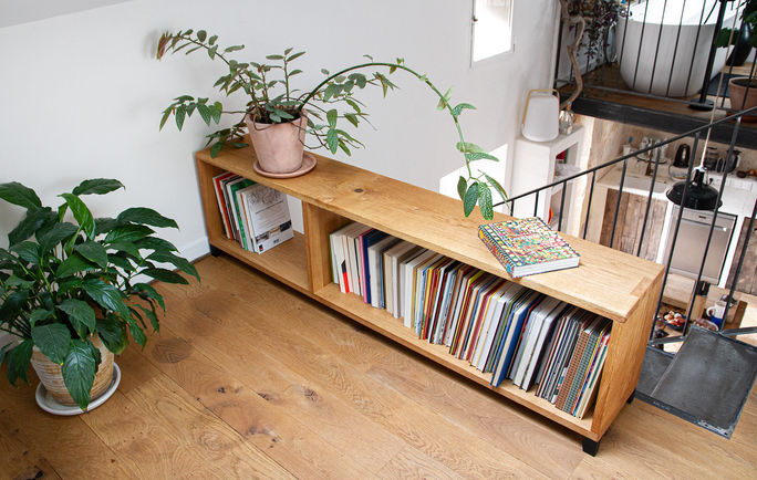 Ayant l’envie de délimiter un espace, le client m’a transmis un croquis qui se voulait épuré. La réalisation ouverte sur les deux faces permet un aperçu des livres selon différents points de vue et garde l’esprit voulu au départ. La finition brossée texture le bois et s’accorde à la décoration existante.
