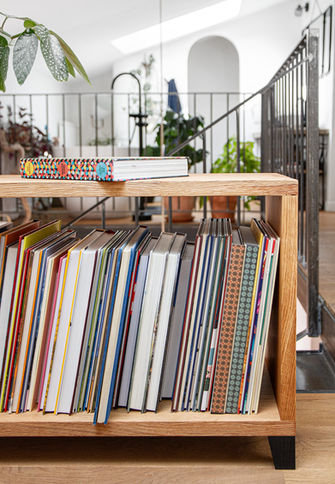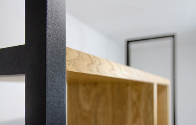 Souhaitant habiller sa montée d'escalier, le client n'avait pas d'idée arrêtée. Après plusieurs propositions, le projet retenu est une étagère suspendue par des montants en acier: la solution est ainsi légère et laisse passer la lumière de part et d'autre.